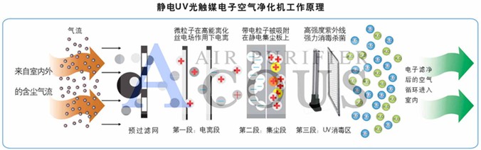 静电UV光触媒电子空气净化机通过空调空气循环的方式对房间内的空气进行净化。净化器由金属过滤网、高压电离器、除尘室、UV光源、光触媒过滤网、活性炭过滤网组成。大部分大颗粒物在通过电子空气净化器的金属过滤网被过滤。更小的颗粒物随气流进入电离区时,被高电压电离。当带正电荷的粒子通过带有负电荷的除尘板时被吸附在除尘板上,强电场可击穿附着在颗粒物表面的细菌,并将其杀死。随后空气进入UV紫外线区被再次强力消毒杀菌。另外在这一过程中,活性炭过滤网和光触媒过滤网可以增强净化空气中的病菌和气态污染物。