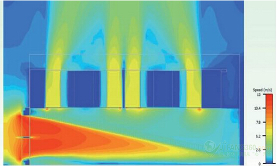 图11:EMI屏蔽进气口的距离与风扇的进气气流分布:30毫米(0.2立方米/秒)。